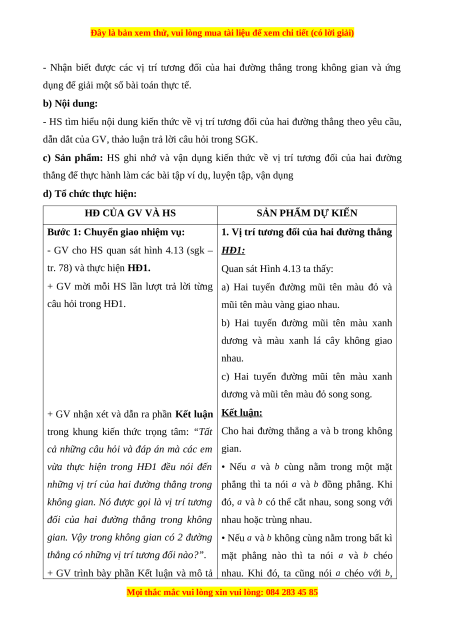 Hoạt động 1: Vị trí tương đối của hai đường thẳng a) Mục tiêu: