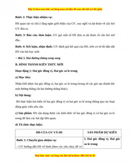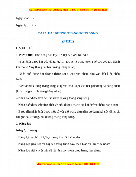 BÀI 3: HAI ĐƯỜNG THẲNG SONG SONG (3 TIẾT) I. MỤC TIÊU: