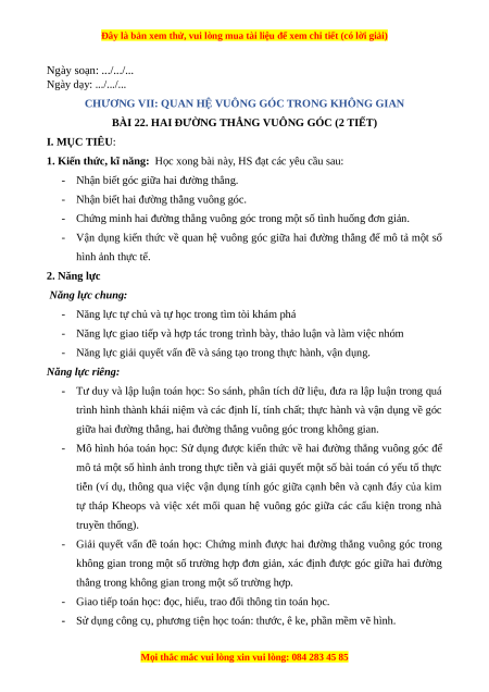BÀI 22. HAI ĐƯỜNG THẲNG VUÔNG GÓC (2 TIẾT) I. MỤC TIÊU: