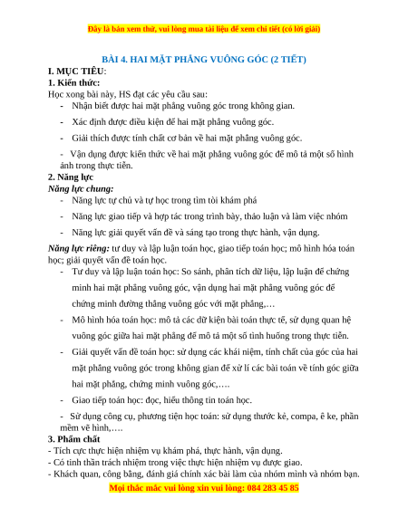 BÀI 4. HAI MẶT PHẲNG VUÔNG GÓC (2 TIẾT) I. MỤC TIÊU: 1. Kiến thức:
