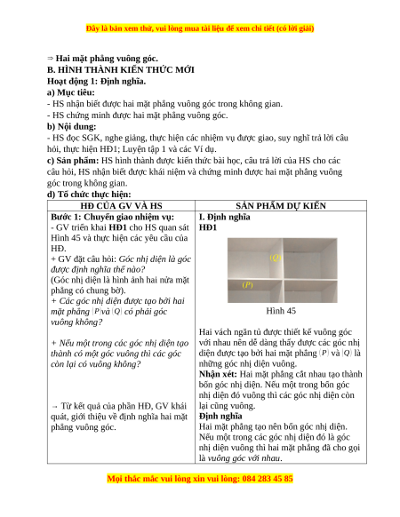 - HS chứng minh được hai mặt phẳng vuông góc. b) Nội dung: