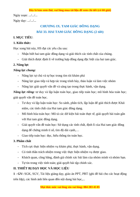 BÀI 33. HAI TAM GIÁC ĐỒNG DẠNG (2 tiết) I. MỤC TIÊU: