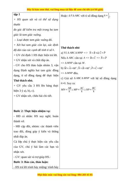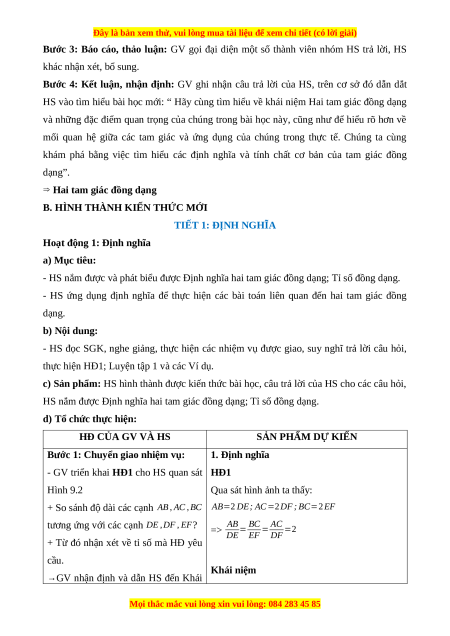 - HS ứng dụng định nghĩa để thực hiện các bài toán liên quan đến hai tam giác đồng dạng. b) Nội dung: