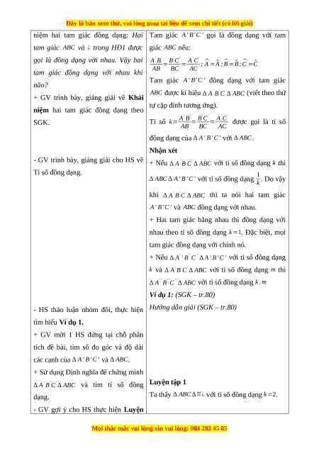 - HS nắm được và phát biểu được Định nghĩa hai tam giác đồng dạng; Tỉ số đồng dạng.