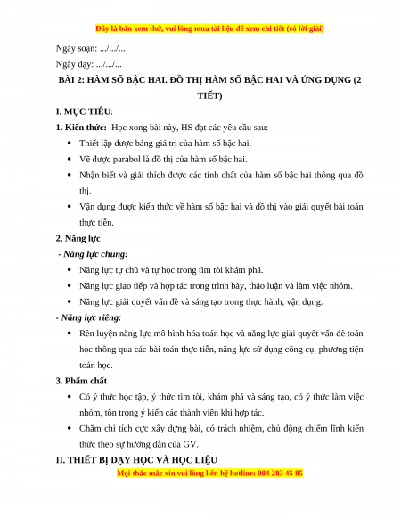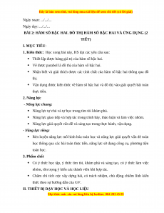 BÀI 2: HÀM SỐ BẬC HAI. ĐỒ THỊ HÀM SỐ BẬC HAI VÀ ỨNG DỤNG (2 TIẾT) I. MỤC TIÊU: