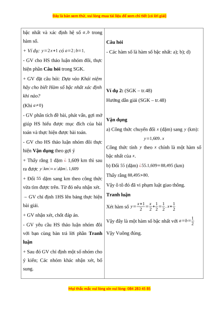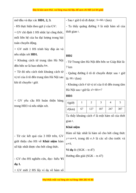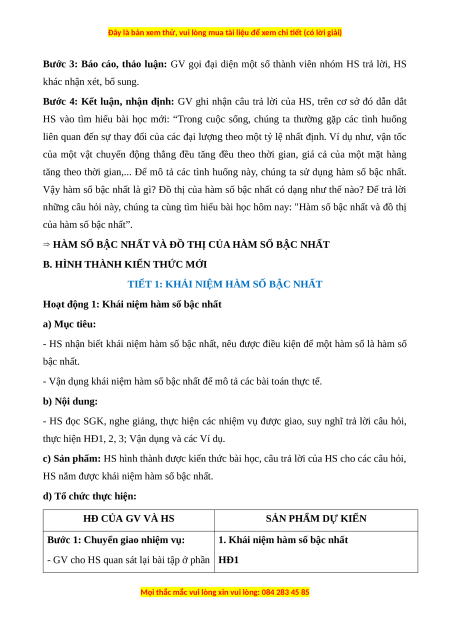 - Vận dụng khái niệm hàm số bậc nhất để mô tả các bài toán thực tế. b) Nội dung: