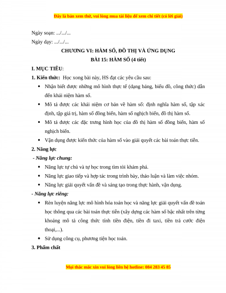 BÀI 15: HÀM SỐ (4 tiết) I. MỤC TIÊU:
