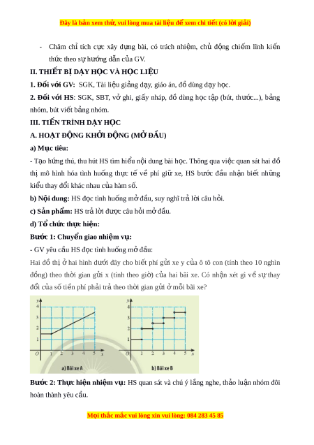 ạ bãi xe A không đ i ổ trong kho n ả g th i ờ gian từ 0 đ n ế 1 gi , ờ sau đó tăng d n ầ ("đ u ề đ n ặ ") theo th i ờ gian. Phí g i ử xe t i ạ bãi xe B không đ i ổ trong t n ừ g kho n ả g th i ờ gian 1 gi , ờ tuy nhiên khi th i ờ gian chuy n ể t ừ gi ờ này sang gi ờ ti p ế theo thì ti n ề phí ngay l p ậ t c ứ nh y ả lên m t ộ m c ứ cao h n ơ . Bư c ớ 4: K t ế lu n, ậ nh n ậ đ nh: ị GV đánh giá k t ế qu ả c a ủ HS, trên c ơ s ở đó d n ẫ d t ắ HS vào bài h c ọ m i