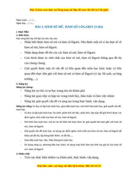 Sử dụng công cụ, phương tiện học toán: sử dụng máy tính cầm tay tính các giá trị của hàm số mũ, hàm số lôgarit. 3. Phẩm chất