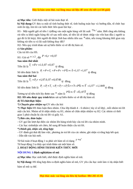 H2- Nêu quy trình khảo sát sự biến thiên và vẽ đồ thị hàm số. c) Sản phẩm: Câu trả lời của HS. H1: Giả sử , đặt Sau năm thứ nhất Tiền lãi là tỷ đồng.