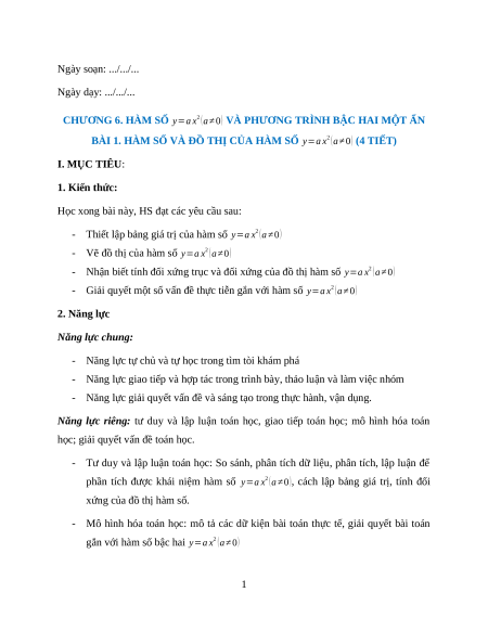 BÀI 1. HÀM SỐ VÀ ĐỒ THỊ CỦA HÀM SỐ y=a x2 (a≠ 0) (4 TIẾT) I. MỤC TIÊU:
