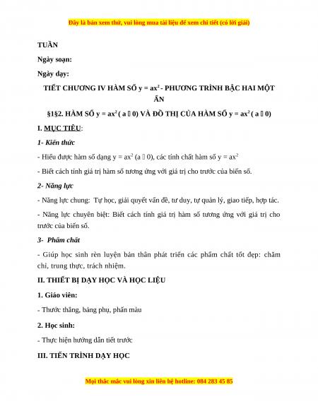 §1§2. HÀM SỐ y = ax2 ( a 0) VÀ ĐỒ THỊ CỦA HÀM SỐ y = ax2 ( a 0) I. MỤC TIÊU: 1- Kiến thức