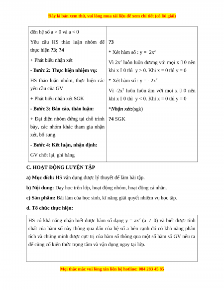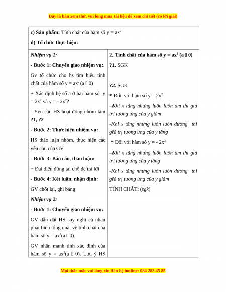 Giáo án Hàm số y = ax^2 và đồ thị hàm số Toán 9 Học kì 2
