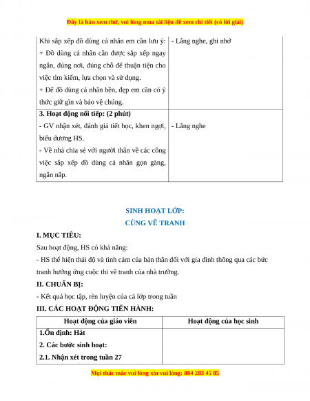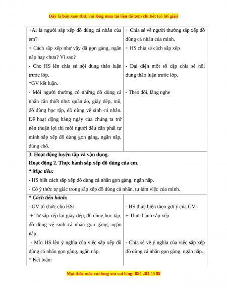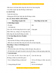 - HS hiểu được mỗi người cần phải tự sắp xếp đồ dùng cá nhân gọn gàng, ngăn nắp. * Cách tiến hành: