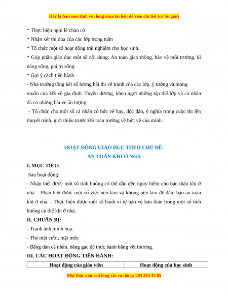 HOẠT ĐỘNG GIÁO DỤC THEO CHỦ ĐỀ: AN TOÀN KHI Ở NHÀ I. MỤC TIÊU: Sau hoạt động: