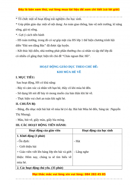 HOẠT ĐỘNG GIÁO DỤC THEO CHỦ ĐỀ: KHI MÙA HÈ VỀ I. MỤC TIÊU: