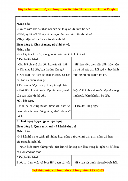 - Nhận biết được những việc nên làm và không nên làm trong kì nghỉ hè để đảm bảo vui chơi an toàn. * Cách tiến hành: