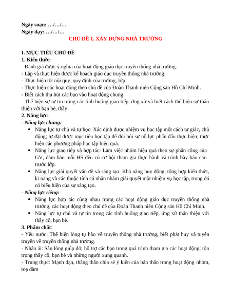 CHỦ ĐỀ 1. XÂY DỰNG NHÀ TRƯỜNG I. MỤC TIÊU CHỦ ĐỀ 1. Kiến thức: