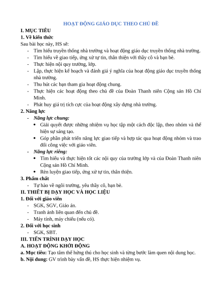 HOẠT ĐỘNG GIÁO DỤC THEO CHỦ ĐỀ I. MỤC TIÊU 1. Về kiến thức
