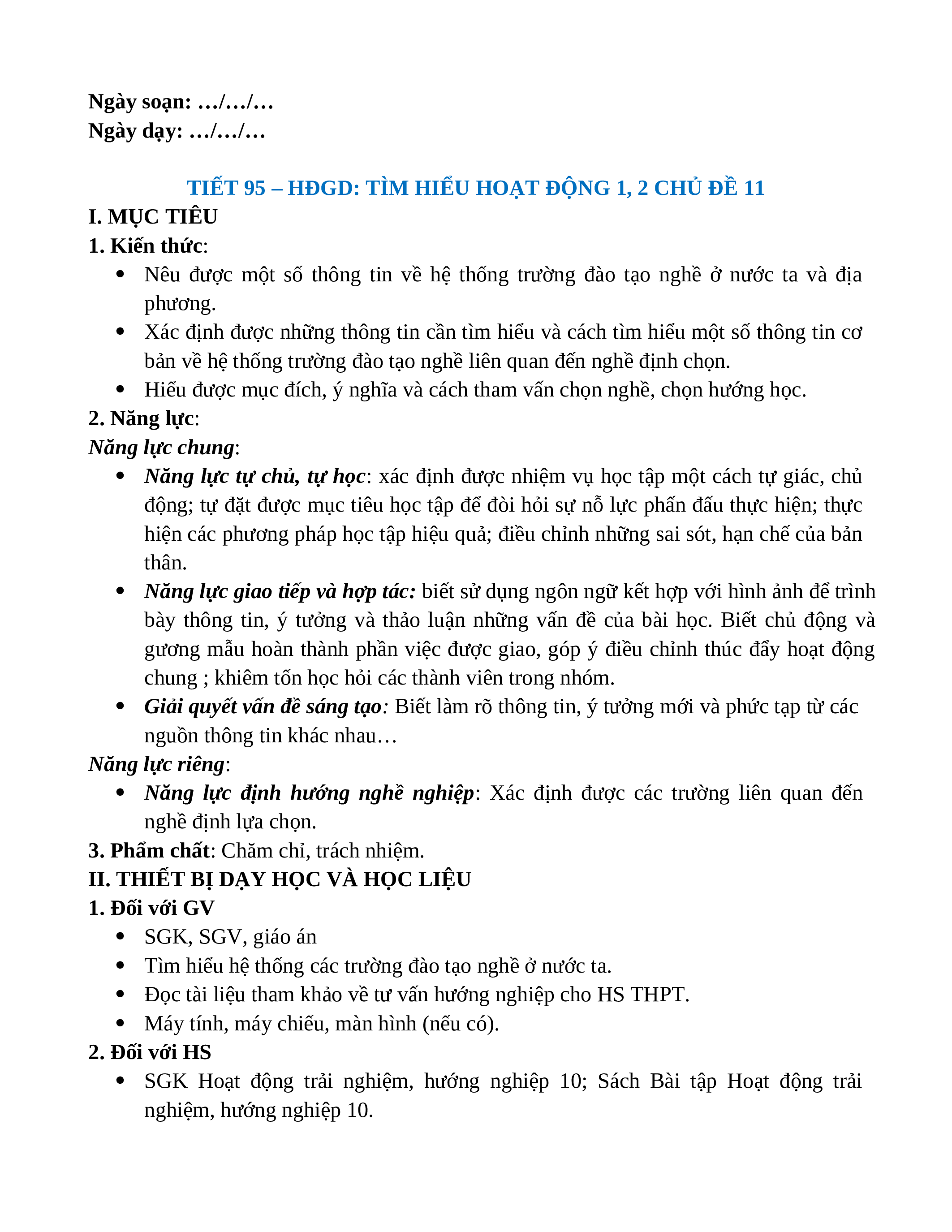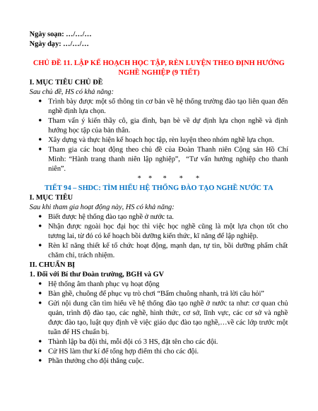 Giáo án HĐTN 10 Kết nối tri thức Chủ đề 11. Lập kế hoạch học tập, rèn luyện theo định hướng nghề nghiệp.