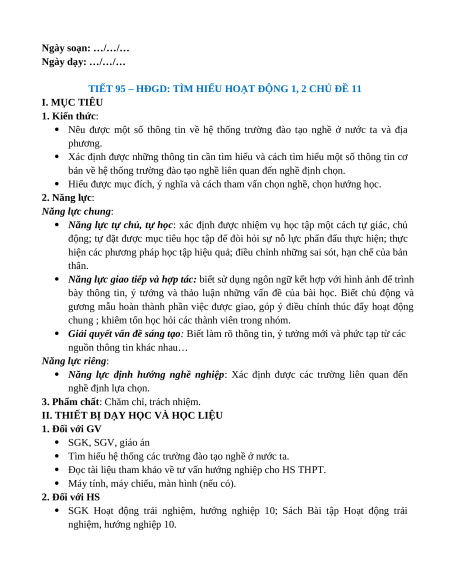 TIẾT 95 – HĐGD: TÌM HIỂU HOẠT ĐỘNG 1, 2 CHỦ ĐỀ 11 I. MỤC TIÊU 1. Kiến thức: