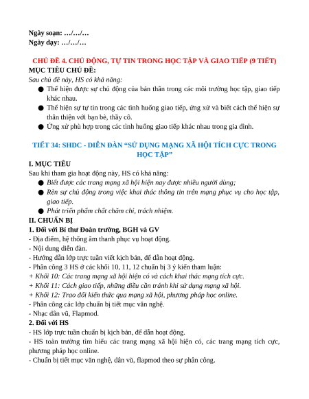 TIẾT 34: SHDC - DIỄN ĐÀN “SỬ DỤNG MẠNG XÃ HỘI TÍCH CỰC TRONG HỌC TẬP” I. MỤC TIÊU