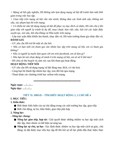 TIẾT 35. HĐGD – TÌM HIỂU HOẠT ĐỘNG 1, 2 CHỦ ĐỀ 4 I. MỤC TIÊU: 1. Kiến thức: