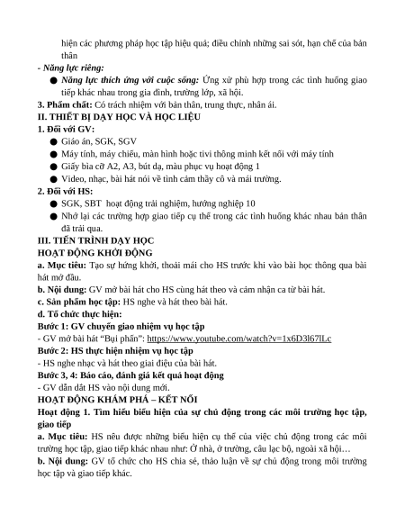 ● Biết chủ động, tự tin, thân thiện, giao tiếp phù hợp 2. Năng lực: