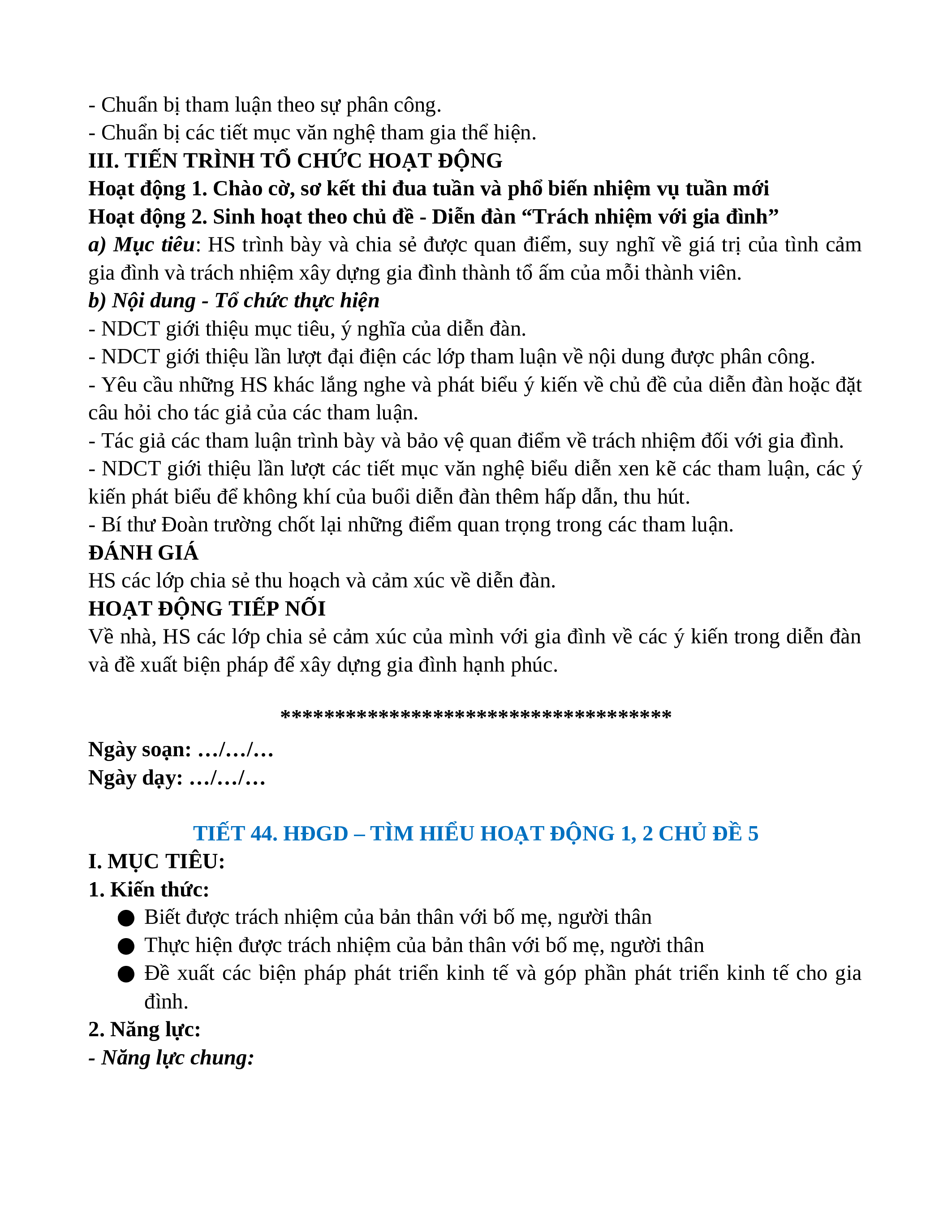 TIẾT 44. HĐGD – TÌM HIỂU HOẠT ĐỘNG 1, 2 CHỦ ĐỀ 5 I. MỤC TIÊU: 1. Kiến thức: