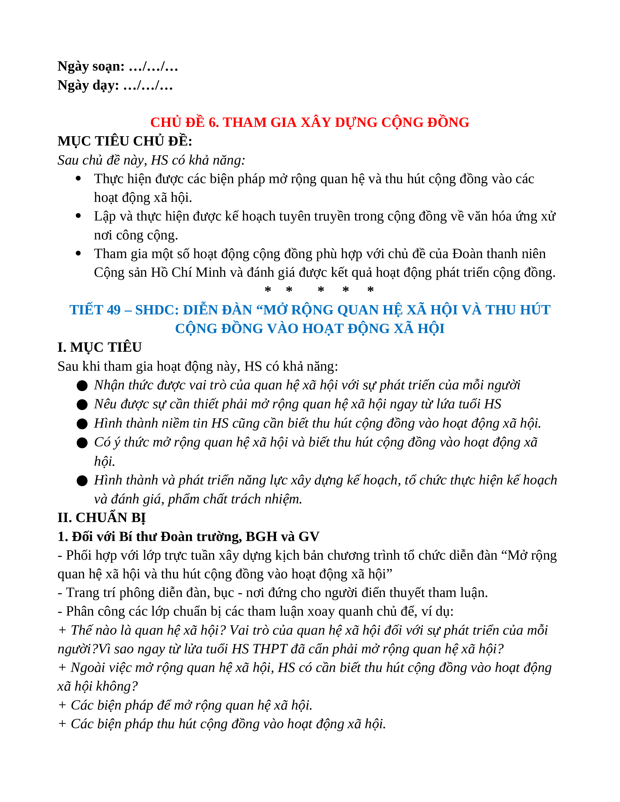TIẾT 49 – SHDC: DIỄN ĐÀN “MỞ RỘNG QUAN HỆ XÃ HỘI VÀ THU HÚT