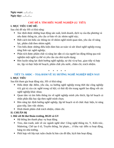 TIẾT 73: SHDC – TOẠ ĐÀM VỀ XU HƯỚNG NGHỀ NGHIỆP HIỆN NAY I. MỤC TIÊU