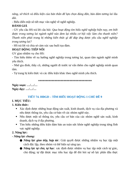 TIẾT 74. HĐGD – TÌM HIỂU HOẠT ĐỘNG 1 CHỦ ĐỀ 9 I. MỤC TIÊU: 1. Kiến thức: