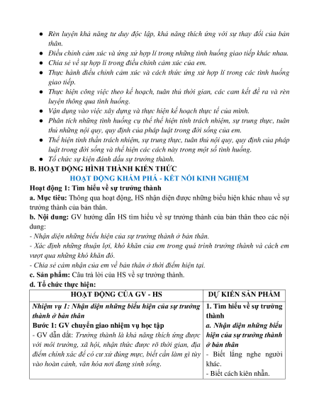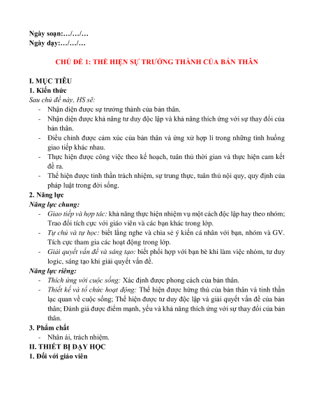 CHỦ ĐỀ 1: THỂ HIỆN SỰ TRƯỞNG THÀNH CỦA BẢN THÂN I. MỤC TIÊU 1. Kiến thức