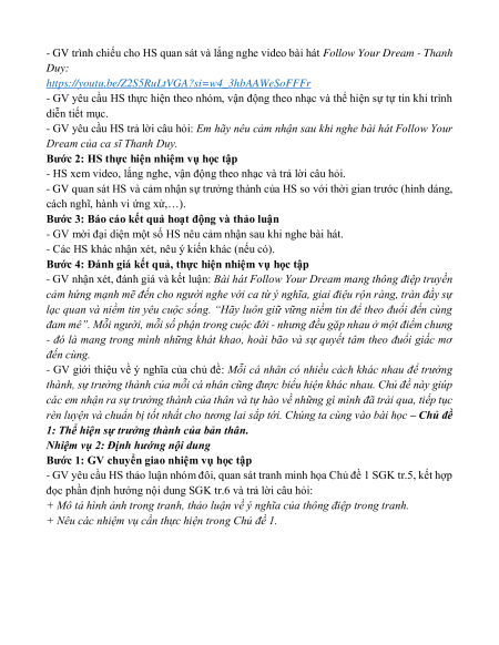 - HS nêu cảm nhận của bản thân sau khi nghe bài hát Follow Your Dream - Thanh Duy.