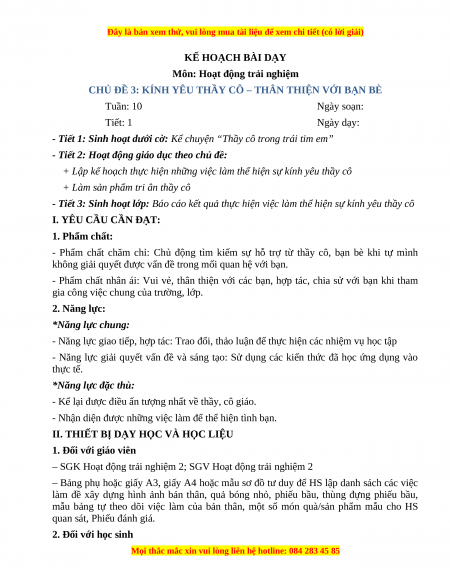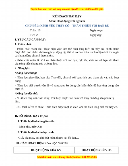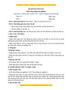 CHỦ ĐỀ 3: KÍNH YÊU THẦY CÔ – THÂN THIỆN VỚI BẠN BÈ Tuần: 10 Ngày soạn: Tiết: 2 Ngày dạy: I. YÊU CẦU CẦN ĐẠT: 1. Phẩm chất: