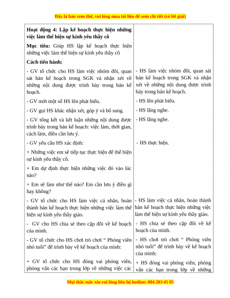 + Lập kế hoạch thực hiện những việc làm thể hiện sự kính yêu thầy cô
