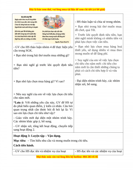 Mục tiêu: Chia sẻ việc lựa chọn chi tiêu cho năm mới. Cách tiến hành: