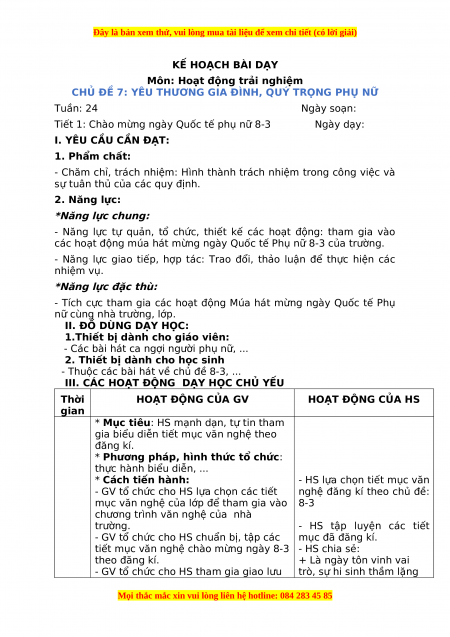 Tiết 1: Chào mừng ngày Quốc tế phụ nữ 8-3 Ngày dạy: I. YÊU CẦU CẦN ĐẠT: 1. Phẩm chất: