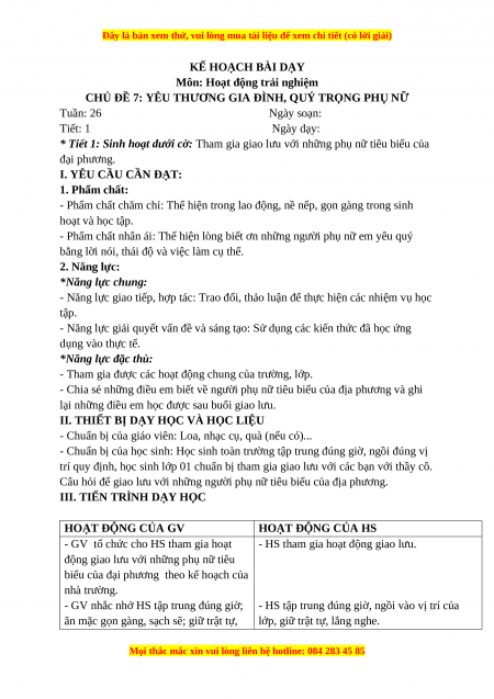 * Tiết 1: Sinh hoạt dưới cờ: Tham gia giao lưu với những phụ nữ tiêu biểu của đại phương. I. YÊU CẦU CẦN ĐẠT: 1. Phẩm chất: