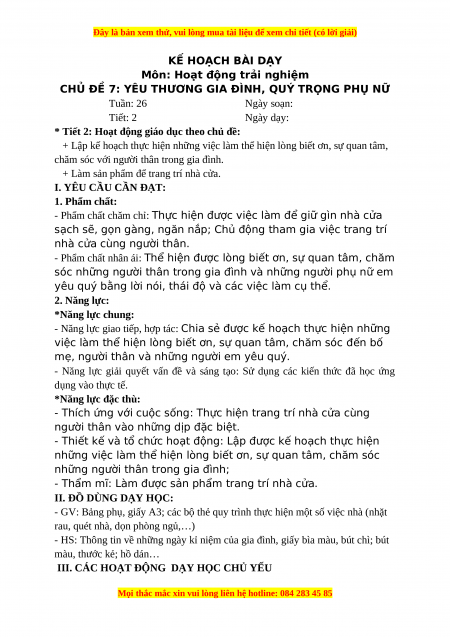 CHỦ ĐỀ 7: YÊU THƯƠNG GIA ĐÌNH, QUÝ TRỌNG PHỤ NỮ Tuần: 26 Ngày soạn: Tiết: 2 Ngày dạy: