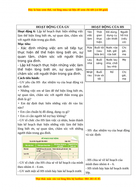 + Lập kế hoạch thực hiện những việc làm thể hiện lòng biết ơn, sự quan tâm,