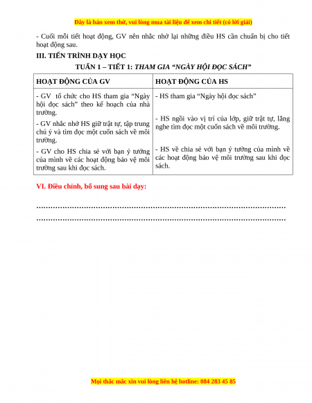- Cuối mỗi tiết hoạt động, GV nên nhắc nhở lại những điều HS cần chuẩn bị cho tiết