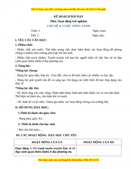CHỦ ĐỀ 8: CUỘC SỐNG XANH Tuần: 1 Ngày soạn: Tiết: 2 Ngày dạy: I. YÊU CẦU CẦN ĐẠT: 1. Phẩm chất:
