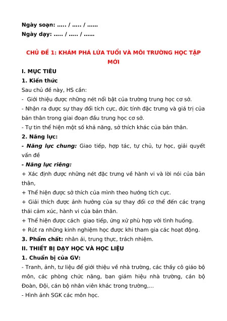 CHỦ ĐỀ 1: KHÁM PHÁ LỨA TUỔI VÀ MÔI TRƯỜNG HỌC TẬP MỚI I. MỤC TIÊU 1. Kiến thức