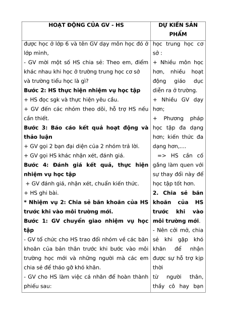 môi trường học tập mới nhằm chuẩn bị sẵn sàng về mặt tâm lí cho HS trước sự thay đổi. b. Nội dung: