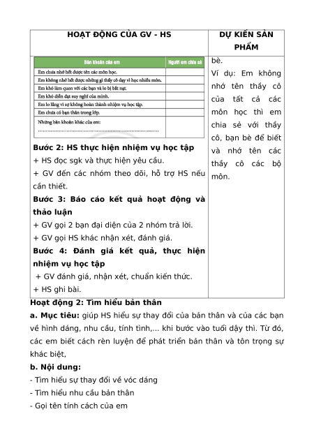 HOẠT ĐỘNG CỦA GV - HS DỰ KIẾN SẢN PHẨM bè. Ví dụ: Em không nhớ tên thầy cô của tất cả các môn học thì em chia sẻ với thầy cô, bạn bè để biết