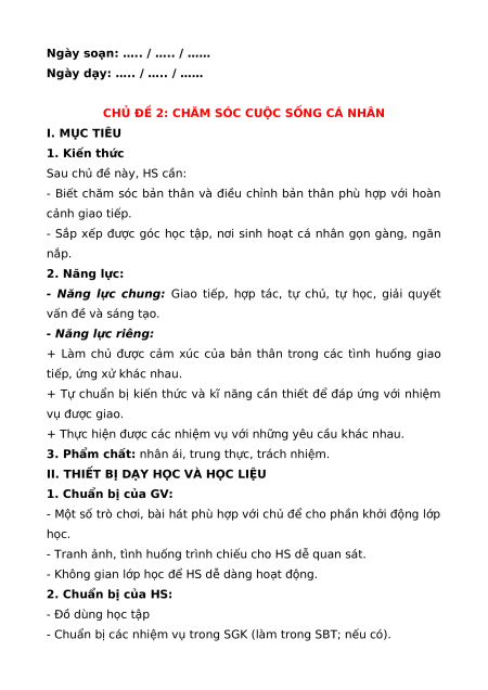 CHỦ ĐỀ 2: CHĂM SÓC CUỘC SỐNG CÁ NHÂN I. MỤC TIÊU 1. Kiến thức