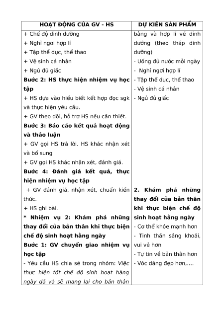 Bước 2: HS thực hiện nhiệm vụ học - Tập thể dục, thể thao tập - Vệ sinh cá nhân