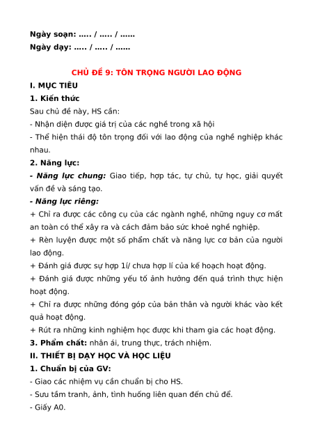 CHỦ ĐỀ 9: TÔN TRỌNG NGƯỜI LAO ĐỘNG I. MỤC TIÊU 1. Kiến thức