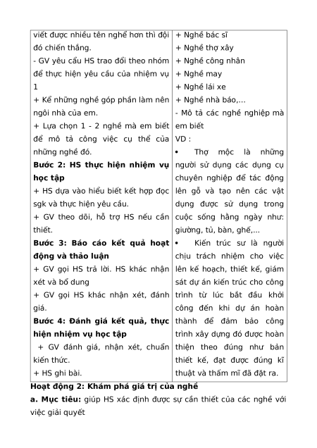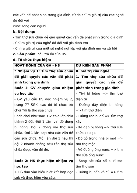 các vấn đề phát sinh trong gia đình, từ đó chỉ ra giá trị của các nghề đó đối với cuộc sống con người. b. Nội dung: